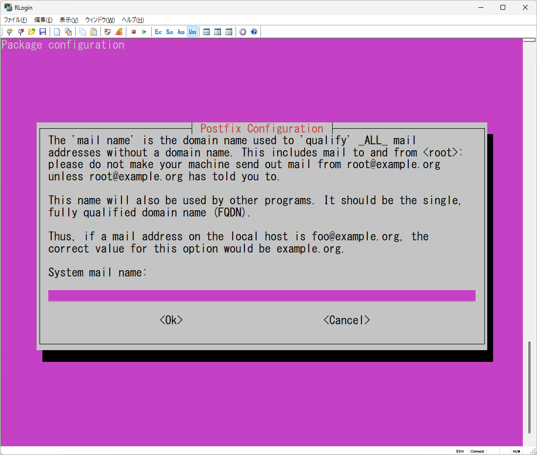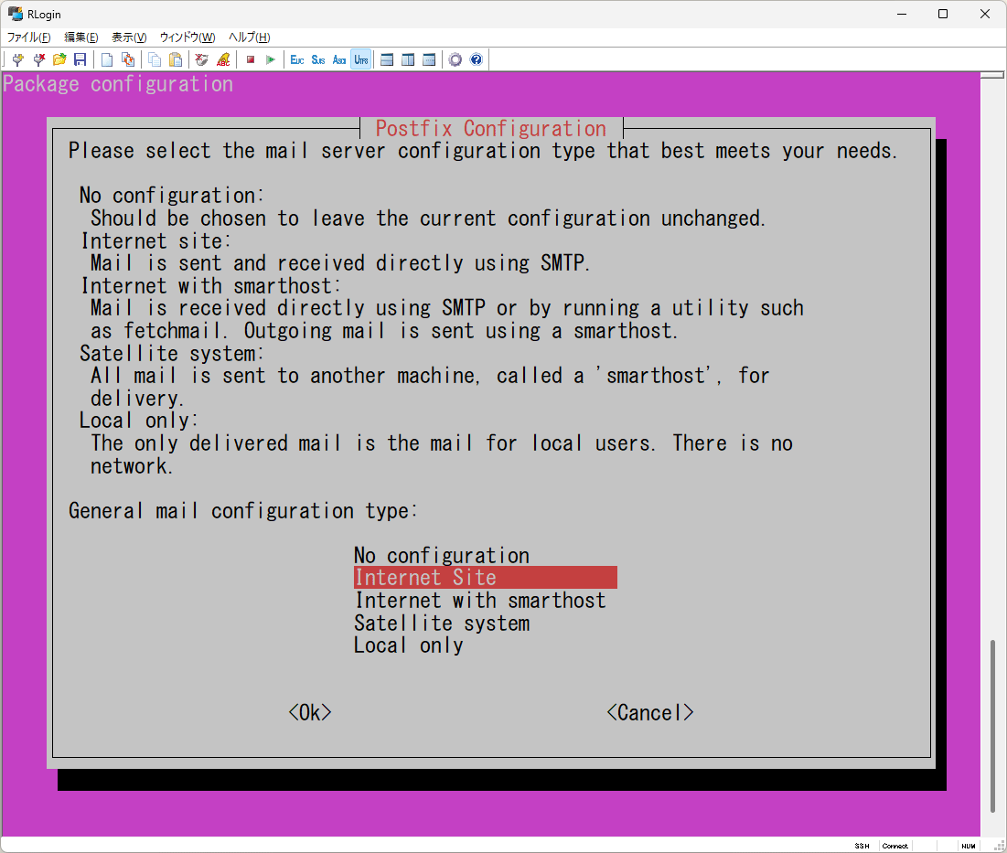 Postfix のインストール中に、Postfix Configuration のウィザードが表示されます。