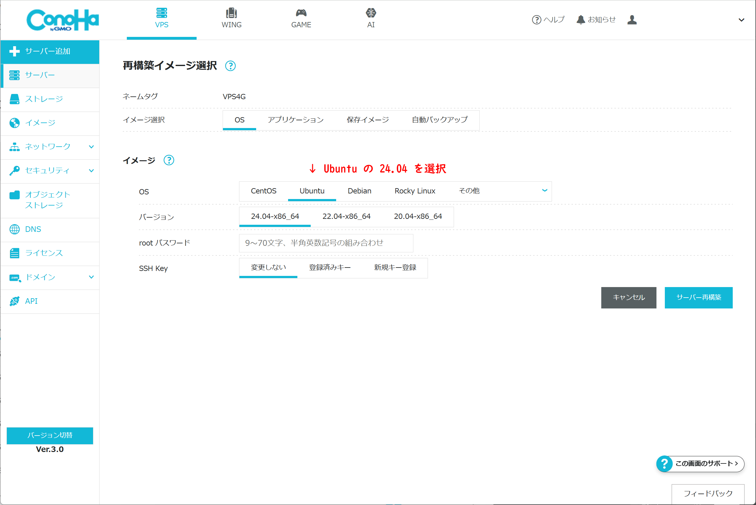 VPSのコントロールパネルで、Ubuntu 24.04 LTSを選び、インストールします。