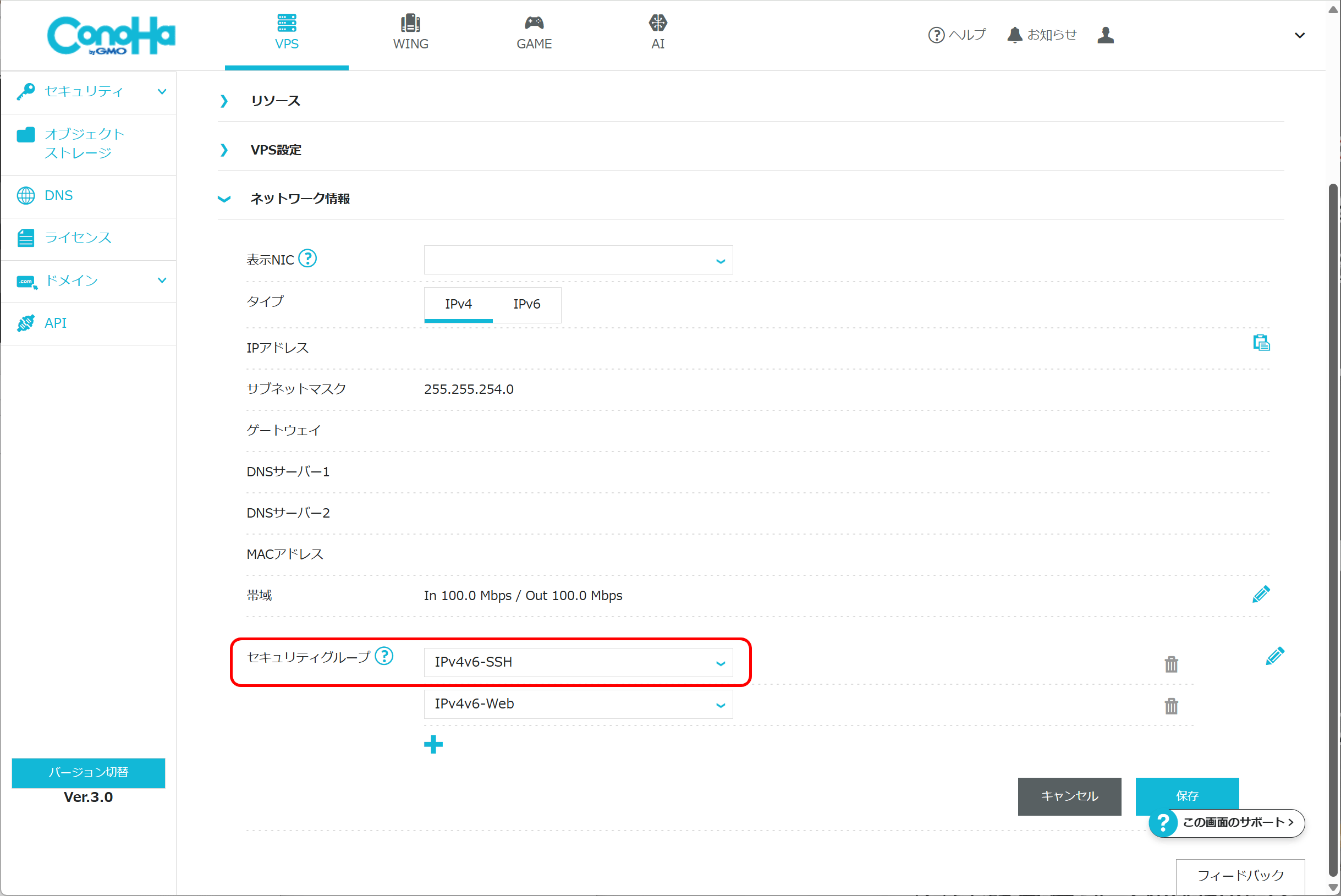 ConoHa VPSのコントロールパネルでセキュリティグループに「IPv4v6-SSH」を追加します。